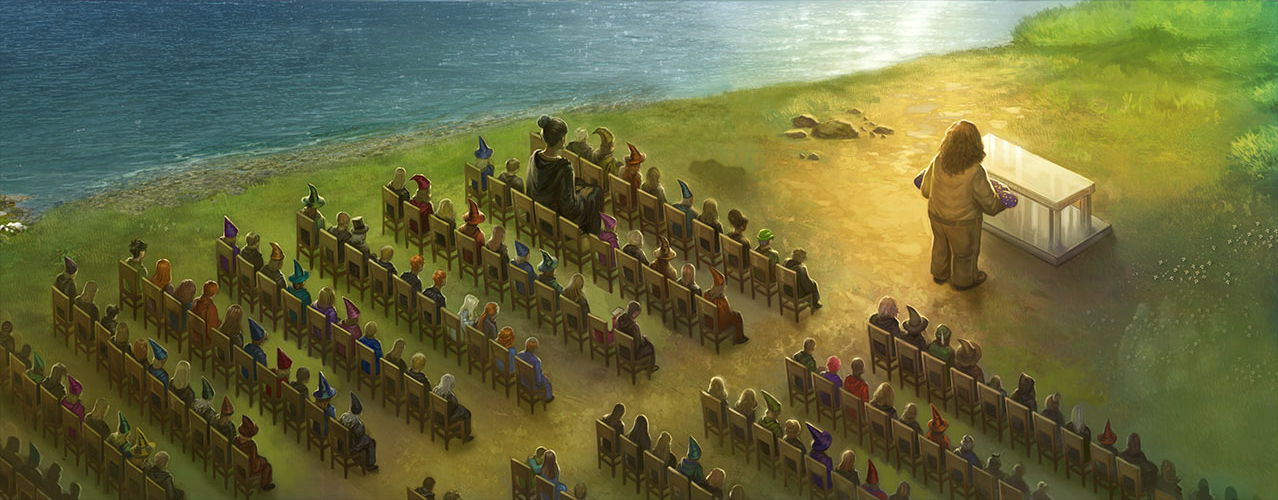 И тогда он увидел их: в нескольких дюймах под поверхностью чистой, зеленоватой, просвеченной солнцем воды хор водяного народа пел на мермише. Музыка ясно говорила об утрате и горе. Когда музыка смолкла, все обратили взгляды на мраморный стол, на котором лежало тело Дамблдора, рядом с которым произносили прощальные речи волшебники. Вдруг Регулус заметил какое-то движение среди деревьев. Кентавры… Они тоже пришли проститься с Дамблдором. Из-под деревьев кентавры не вышли, но Гарри видел, как они тихо стоят, опустив луки и глядя на волшебников. Тут и речи закончились. Разом вскрикнуло несколько голосов. Яркое белое пламя полыхнуло, охватив стол, на котором лежало тело, в следующую секунду огонь погас и на месте стола все увидели белую мраморную гробницу, укрывшую в себе тело Дамблдора. Кентавры выпустили тучу стрел в качестве последнего прощания и ушли в лес, водяной народ тоже медленно опустился в зеленоватую воду и скрылся из глаз. Гарри взглянул на Джинни, Рона и Гермиону: Рон морщился, Джинни, казалось, скучала, а Гермиона следила за происходящим с любопытством исследователя.
