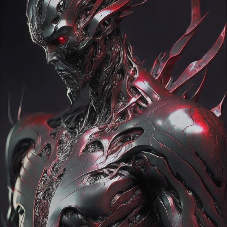 Ещё одна трансформация тела и вот его тело покрывается уже бронёй из затвердевшего покрытия моей крови, ручейки, вытекающие и возвращающиеся в него, сгустились, стали плотнее и затвердела, образовавшейся лезвия и шипы на руках, спине и голове. В просвета снова стало видно быстрое движение жидкости, но если при смотреться, то ещё глубже можно было различить едва заметный свет, лучше всего видный в его глазах. Яркий, красный свет, исходящий из него в следствии начала активного процесса ядерной реакции внутри него с выделением большого количества энергии.
