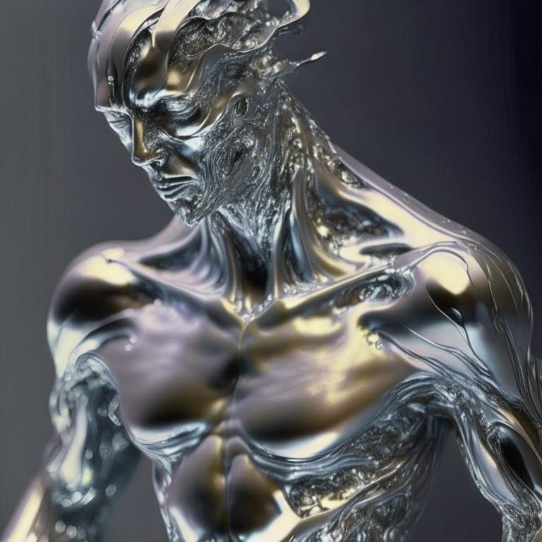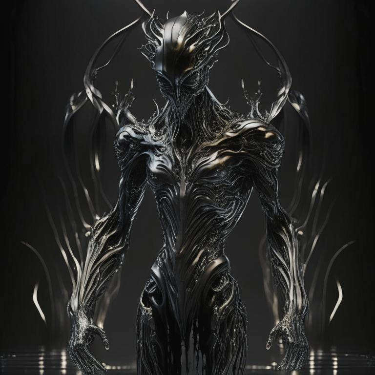 Высокое, два метров в высоту, существо, казалось, состоящее не из крови, а из жидкого металла, но тут все ясно — следствие изменения состава моей крови, отчего она больше была похожа на ртуть, чем на человеческую кровь. В местах на меньшей подвижностью кровь сгущалась, становясь почти неподвижной, напоминая затвердевшей металл, образующий полосы, заменяющее кожу, в просветах которых можно было увидеть постоянно движущуюся и перетекающую с места на место серебристо-металлическую кровь. Кисти у этого существа почти не отличались от человеческих по строение, так же были пятипалыми, и пальцы имели аналогичные человеческим сгибы. Предплечья у существа были утолщенными, а вот плечо, напротив, более худым и тонким, коротким. В целом, таким же образом, из статичного внешнего покрова сгустившейся крови и текущей жидкости под ним, состояло все тело существа, но вот голова сильно отличалась от человеческой. Рта не было вообще, только большие глаза, от которых ниже шла постоянно дрожащая моя кровь, словно переходящая к продолжительный остро конечный подбородок. Выше глаз кровь была наиболее статична, отчего создавалось впечатление, что на голову одет какой-то шлем из которого постоянно вытекала небольшие ручейки серебристый крови, медленно двигающиеся из стороны в сторону. Из всего его тела, особенно из спины, постоянно вытекали жгуты крови, делали петлю и возвращались в его тело.