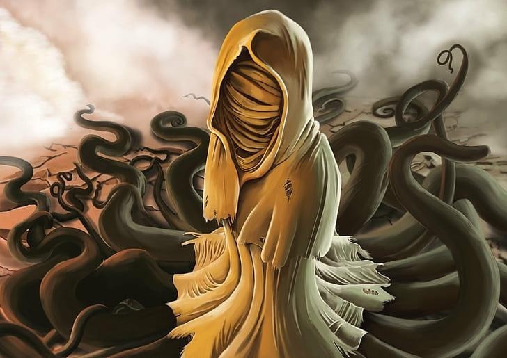Постепенно, по мере уменьшения этого вихря, золотых цветов в нем становилось всё больше и больше. А когда вихрь уменьшился уже до пары сотен метров в диаметре, эти золотые отблески, являвшиеся золотыми нитями, уже сплелись в полотна, которые, в конце концов образовали огромный кокон, что исходил желтовато-золотистым светящимся, даже при дневном свете, дымком, словно это пыльца исходила с поля цветов, поднятая прорывом ветра. Кокон начал шевелиться изнутри, когда последние остатки чёрного вихря пропали где-то внутри него, и золотая ткань стала менять свою форму, становясь уже одеянием для огромной, очень похожей на человека, фигуры, размеры которого, правда, достигали шести метров в высоту. Ничтожно малый размер, в сравнении с моим или Великой Матери телами, но, тем не менее, я чувствовал, как перерождение было почти окончено. Высокая, для человека, фигура, стала уменьшаться, ужиматься, вскоре достигнув размера всего в метр-семьдесят. Фигура не имела ног — вместо этого опорой фигуре служили десятки темно-зелёных щупалец разной толщины, длины и размера, что постоянно извивались и переплетались, но надёжно удерживали владельца в вертикальном положении — так при перерождение сказалось наличие уже слившегося с телом Тейлор симбионта моего производства. Рукавов никаких не было, как и отверстий для рук. Вблизи одеянием её было, казалось, старым и сильно потрепанным, но я видел, как мелкие огрехи и прорехи прямо на глазах зарастали. Она все ещё продолжает совершенствовать свой облик и подстраиваться его под себя для своего комфорта. Ткань переходила в глубокий капюшон, который закрывал лицо Тейлор, но даже загляни кто под капюшон, увидит лишь кучи золотых бинтов, что полностью на перебой скрывали её лицо — сказались привычки Тейлор скрываться от людей, скрывать свою личность, быть неприметной, что возымела эффект при перерождении. Отсюда стандартный для людей размер, а так же полное сокрытие тела и лица.