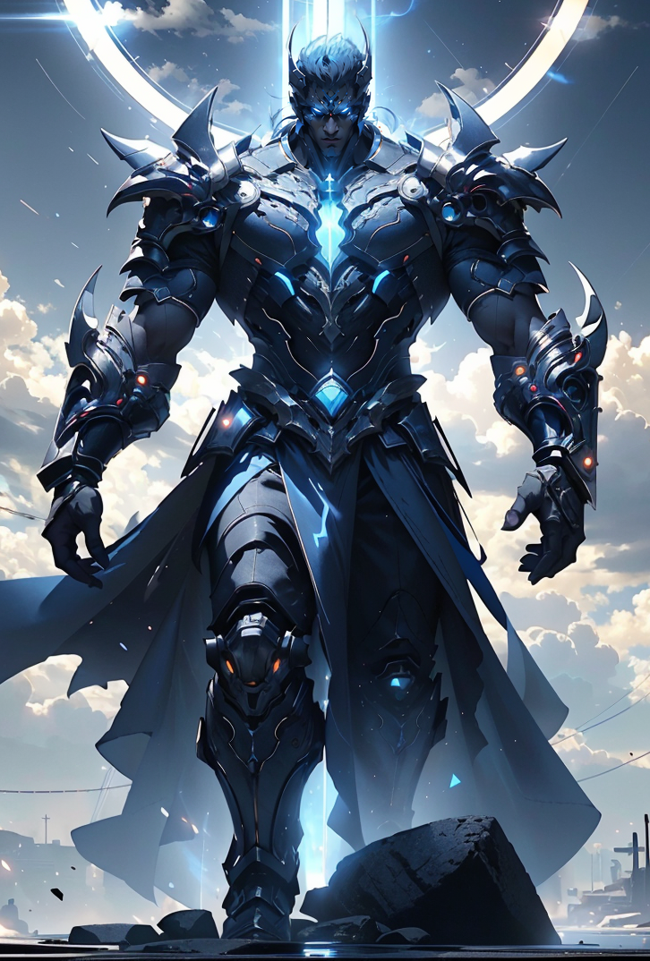 Выглядел он как и подобает своему имени, мега пафосно. Броню он сам кастомизировал, сделав похожим на тяжелую, но которая не стесняет движения и лишь подчёркивает его фигуру.