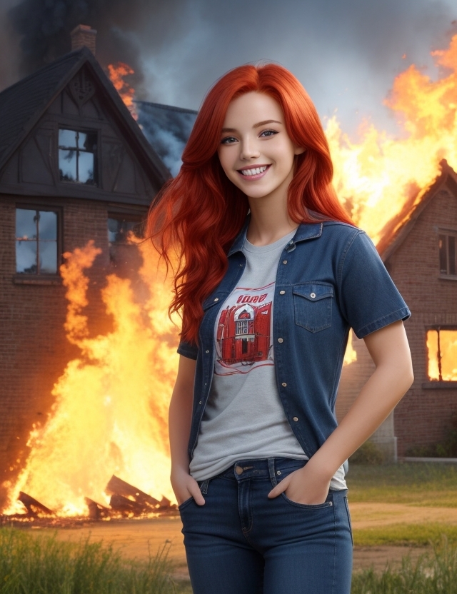 Она выпучила глаза в сторону дома и вытянула вперёд руки. Через мгновение дом начало охватывать жаркое пламя. Пожар занялся практически мгновенно и практически во всём доме, что говорило об огромной силе пирокинеза девушки.