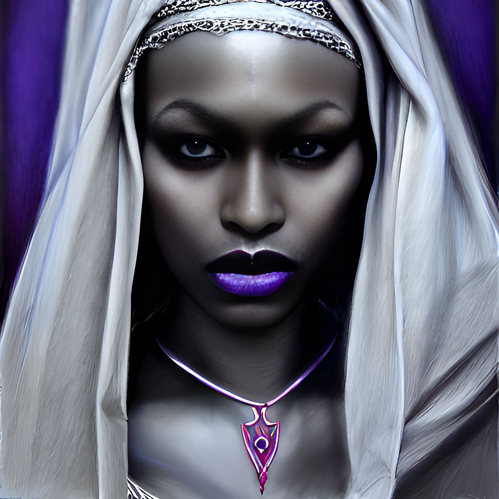 Чернокожая девушка с острыми ушами, затянутая в чёрный кожаный комбинезон наподобие латексного костюма, возвышалась над крепким воином. Как и у него, у неё были пепельные волосы до лопаток. В жёлтых глазах женщины поселилось вечное презрение в смеси с превосходством. Из оружия у неё были лишь плеть и небольшой жезл из лапы гигантского паука с навершием в виде эльфийского черепа.