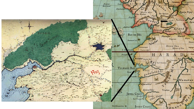 — Нет, — рассмеялся купец. — В восточной оконечности большого залива бескрайнего западного моря находится наш самый большой город Бозиш-Дар, на вестроне Харшпорт, и плодородные земли региона Радж вокруг него, куда приток моря и довольно большая река Риеша приносит влагу в почву. В Севе́т Кови́не, торговом квартале Бозиш-Дара, можно приобрести все, что душе угодно, от румян, пряностей и шелка, до костей и шкур гигантских животных из Мумакана. На Катедрале́, холме, возвышающимся над городом, где под пышными пальмами стоят особняки богатых, среди знати кипят политические интриги. Это город — космополит, где наша собственная культура, смешалась с традициями умбарцев и нуменорцев.