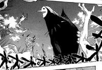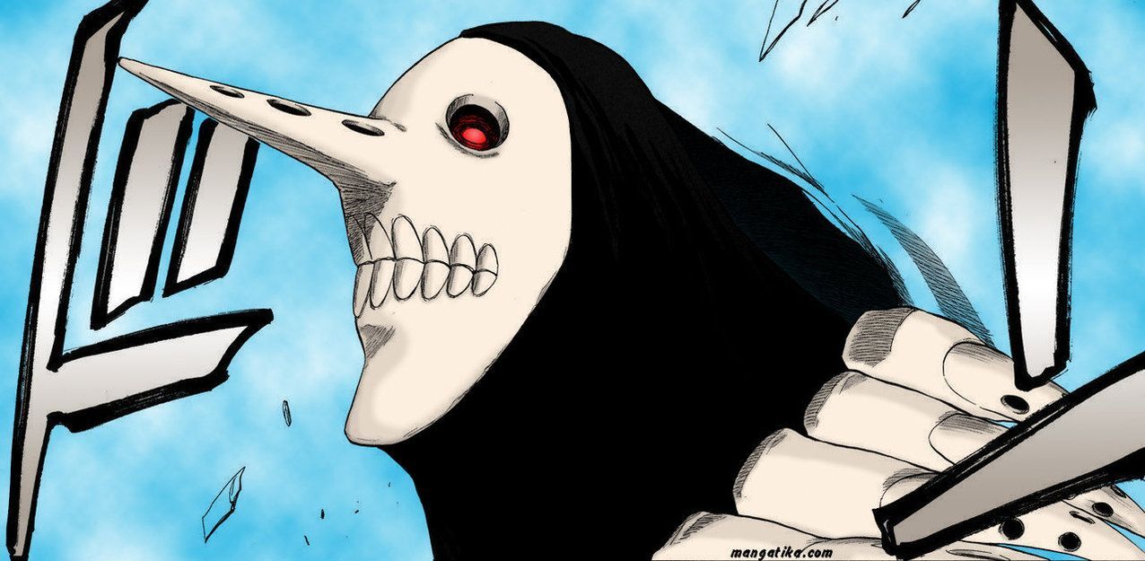 Шинигами с шоком наблюдают за этим, замечая, что серебряной вспышкой был всего лишь один меч, что вонзился в переносицу Меноса почти по самую рукоять.