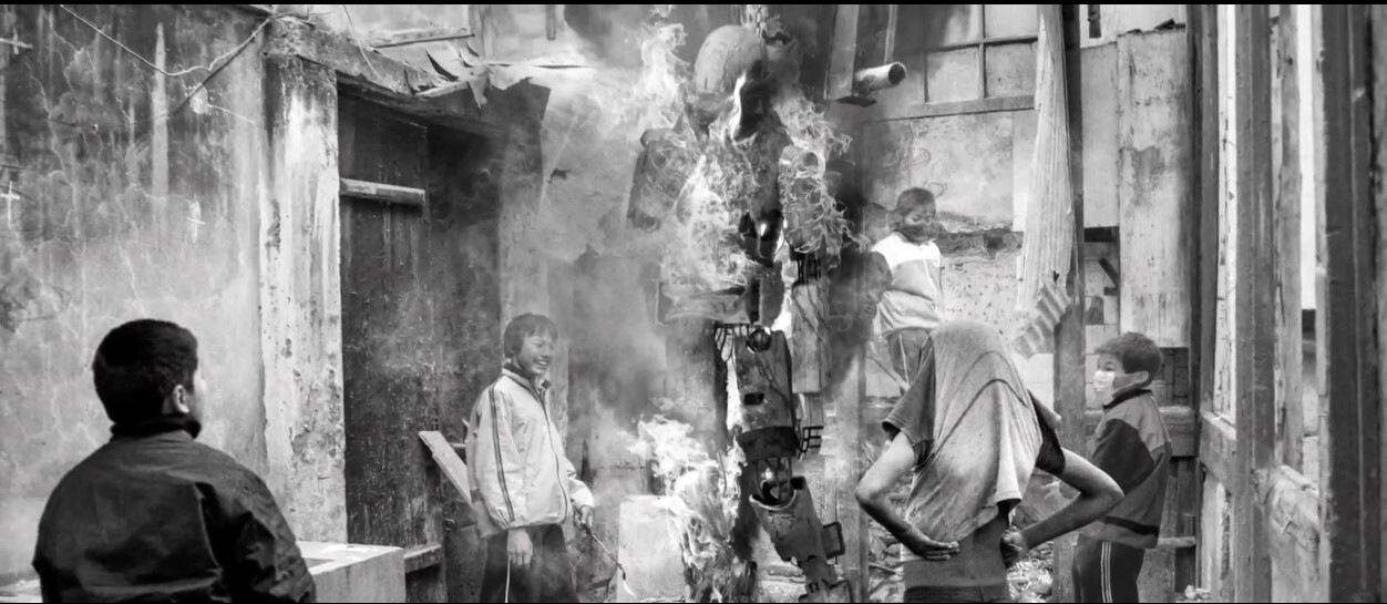 Тем не менее, в первой сцене фильма представлена красноречивая сцена. Страховщик приходит в квартиру одной семьи. Андроид держит расчёску для собак, на полу лежит мёртвая собачонка, в соседней комнате на полу играет ребёнок 3-4 лет. Отец семейства настаивает на том, что робот убил собаку, члена семьи, что это страховой случай и требует денег. Страховщик нехитрым образом доказывает, что робот исправен, а жена видя ситуацию, укоряет мужа, говоря, что это была плохая идея и из неё ничего не выгорело. Таким образом ясно, что экономическое положение этих людей настолько отчаянное, что они приносят в жертву свою собаку, чтобы получить страховку.