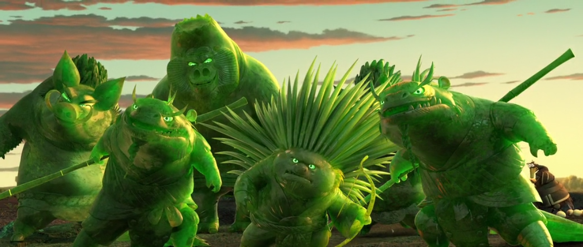 Врагами которым противостояла пятёрка оказалась троица мастеров выпущенная Каем и первой добравшаяся из общего состава ищеек до реальных учеников Угвея, а не остальных мастеров иных школ, что переняли общие принципы просветлённой черепашки-ниндзя, но пошли своим путём. Если же обращать внимание на вид противников, то это были два барсука вооружённых копьями и умеющие отлично кооперировать свои атаки, будто читая мысли друг друга, что с учётом, что всеми ними отдельно руководил один Кай, не было слишком сложной задачей. Вместе с ними так же присутствовал лучник дикобраз, что использовал в качестве стрел собственные иглы, создавая море вопросов о его стиле боя во время пребывания в мясной тушке, а не регенерирующей нефритовой прочнейшей кукле.