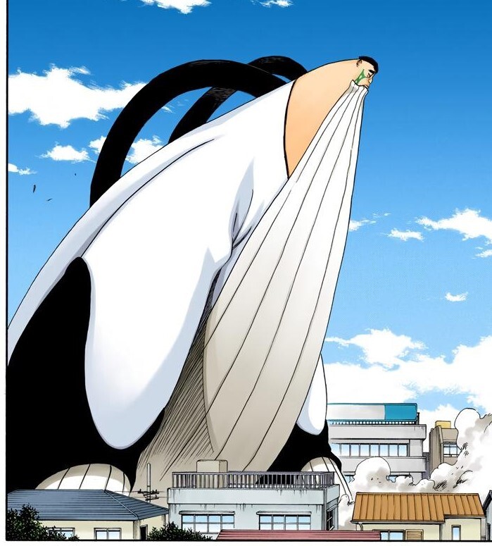 Он изменился. Всё его тело раздулось до неимоверных размеров, он теперь ростом с жилой дом на десять этажей, не меньше. Разорванное ударом Зангецу брюхо заросло толстой мешковатой шкурой. Огромные руки опускаются до самой земли, ноги же, наоборот, уменьшились. Он стоит на четвереньках. Нелепая пародия на великана и кита сразу.