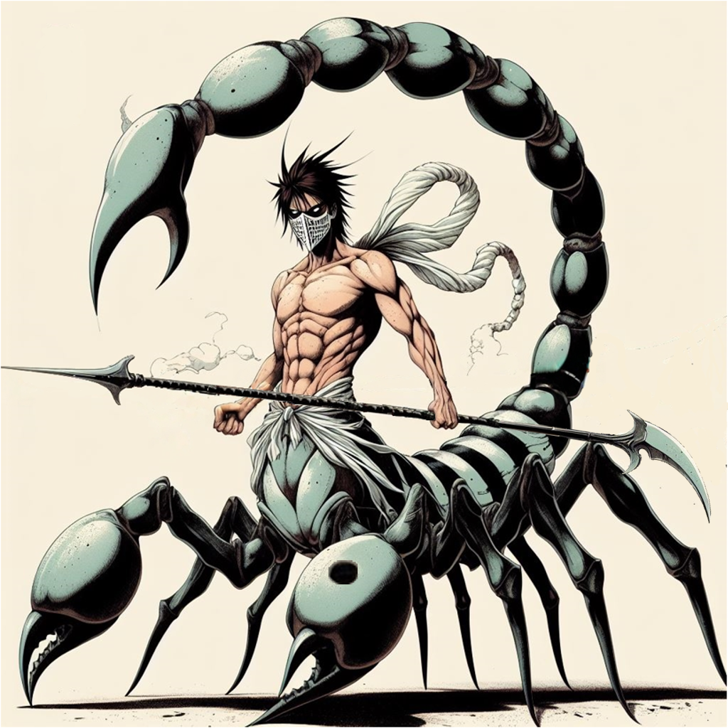 Эдакий кентавр-скорпион — по сути, он имел полноценное туловище скорпиона, только вместо головы начиналось человеческое тело. Жало, куча ног, две клешни (причём на одной из них как раз располагалась дыра пустого) — всё при нём. Остаки маски почему-то сильно видоизменились, переместившись с верхней части головы на лицо, и теперь он имел намордник вроде того, в котором красуется Третья Эспада. При этом он заметно увеличился в размерах, став даже больше, чем был в бытность свою адьюкасом. Ну и, конечно, копьё — оно тоже подросло в размерах, под стать телу арранкара, и к тому же обзавелось вторым лезвием-жалом на обратной стороне. Так что теперь это, наверное, уже не нагината, а глефа, если я правильно помню терминологию.