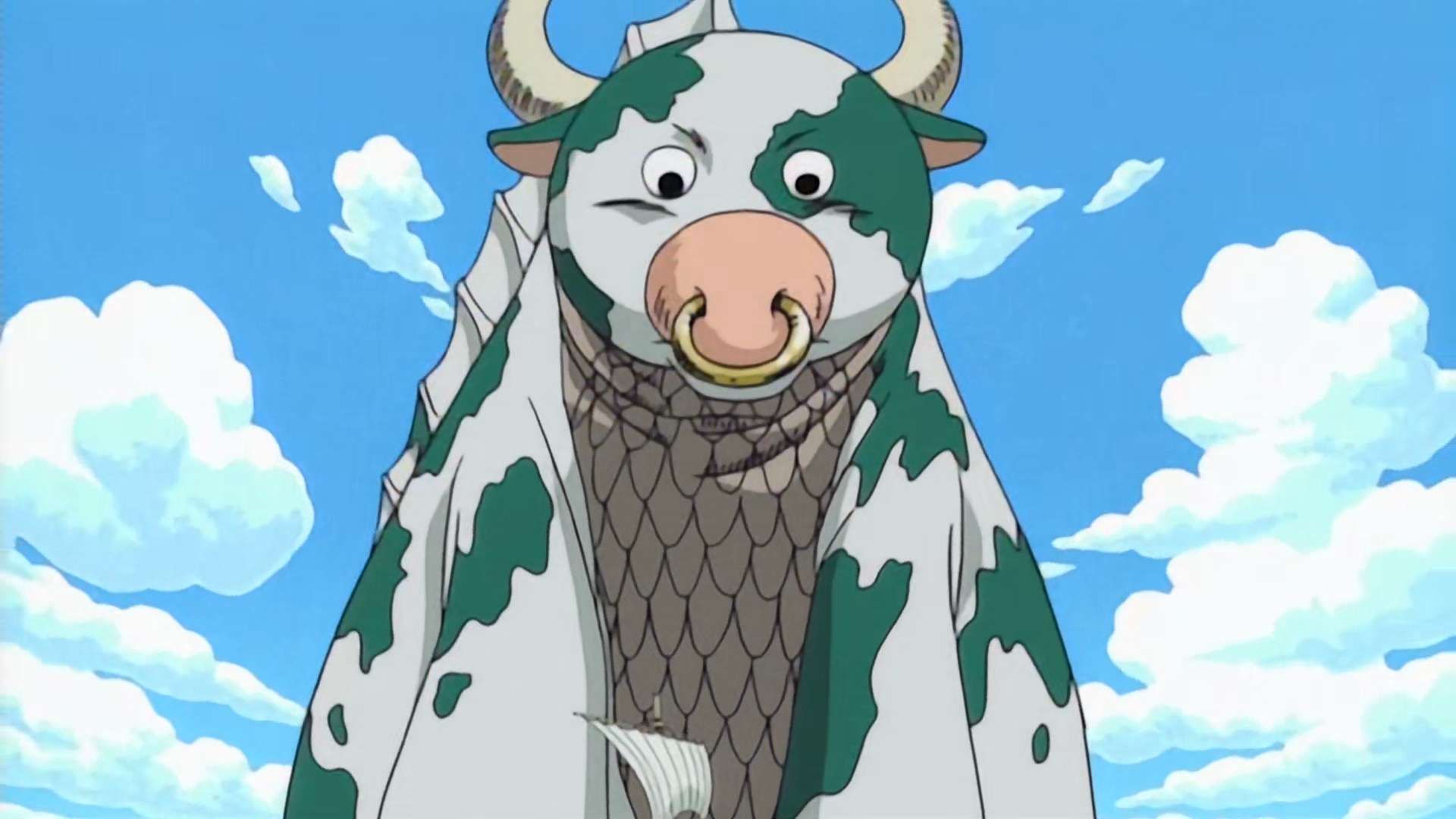 Широко улыбнувшись Луффи раскрутился выстрелил ногой мимо монстра, и когда резиновая нога вернулась она раскрутила его тело на большой скорости придав тому силу инерции , которую он использовал чтобы нанести сокрушительный удар по голове коровы, ну или рыбы, оторвав ему один рог.