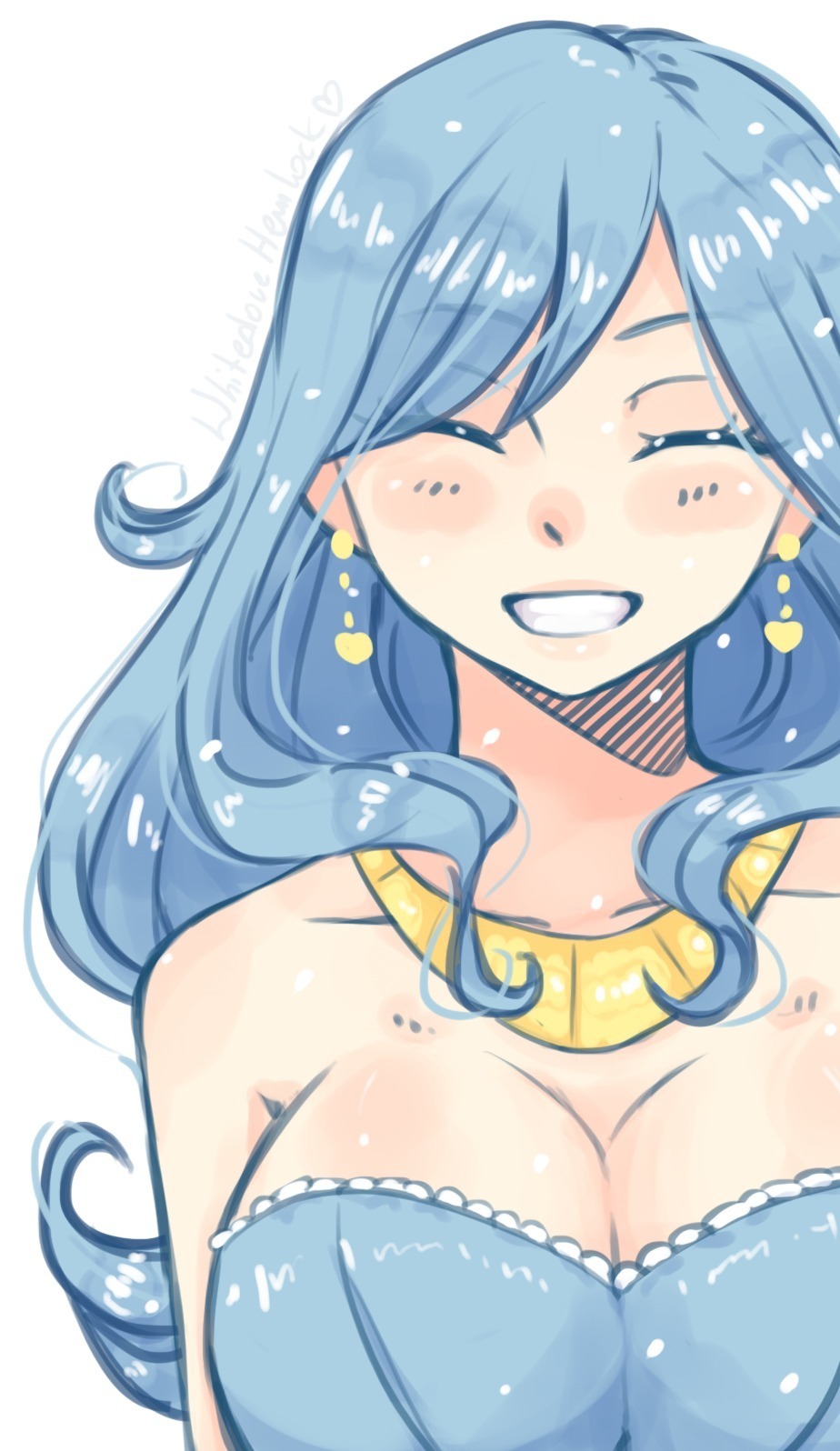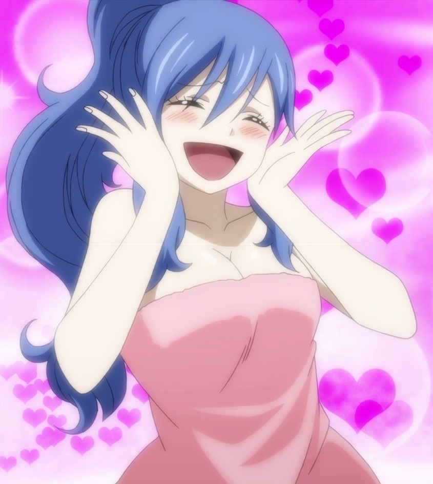 Его мысли резко прервались благодаря прекратившемуся шуму воды, после которого, дверь ванной комнаты резко открылась и затем, из нее радостно выпорхнула счастливая обладательница синих волос, завязанных в конский хвост. Сияя улыбкой и пылающим румянцем, Джувия была обернута розовым полотенцем на обнаженное тело, чем не зная того, нанесла сокрушительный удар по выдержке мага.