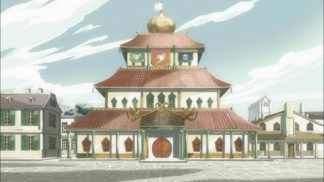 В результате, пройдя всего лишь пару домов, подросток оказался на улице, где как раз и расположилась знаменитая гильдия. Трехэтажное здание из белого кирпича с оранжевой черепицей на каждом сегменте строения и при этом, на его вершине находился сияющий золотым, луковичный купол с развевающимся на нем флагом. Но помимо прочего, на самом верхнем, маленьком этаже, были вывешены три разноцветных, геральдических флага — Королевство Фиор, Хвост Феи и скорее всего, символ Совета. А ведь ткань с изображением герба гильдии побольше будет…