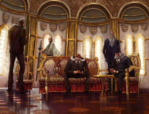 Коридор окончился дверным проёмом, за которым, распределившись по просторному, даже огромному кабинету, обнаружилось пятеро крепких на вид стариков. Все пятеро глядели в сторону вошедшего. Чёрные строгие костюмы, отложенные в сторону накидки, белое пятно облаченного в просторное кимоно мечника, что ни на секунду не расставался со своим оружием… и жуткое чувство давящего присутствия, разгоняющее даже вездесущий туман.