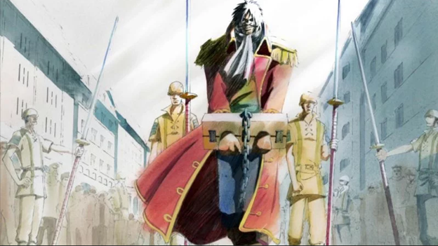 Появилась вдали фигура, медленно бредущая к собственной смерти. Красный плащ с золотыми эполетами — будто пропитанный кровью адмиральский — «шутка» легендарного пирата. Обычные деревянные колодки на руках, скреплённые цепями с железными кандалами на ногах… Вообще не преграда для заключенного, но тот не спешит с ней расставаться. За спиной его — даже не дозорные. Стражи из городской тюрьмы, едва ли не гражданские с холодным оружием в руках. Всё это — фарс, что прекрасно осознавали все именитые гости, посетившие казнь великого человека. Приглашенные и нет.