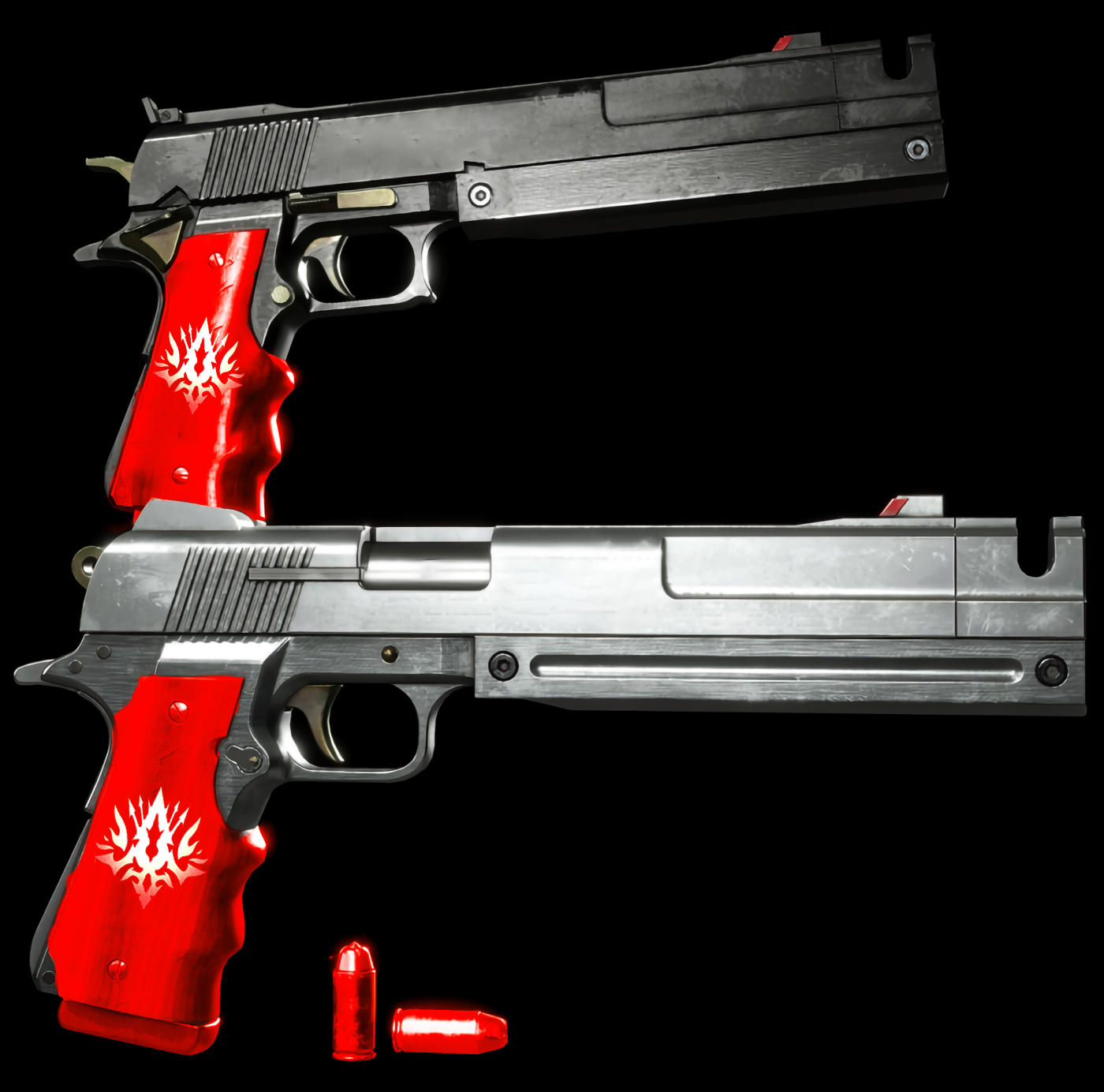 Всех атакующих колдунов и нежить я убивал из своего нового оружия, которое я также хотел протестировать. Мои попытки создать маго-огнестрельное оружие привели к двум мощным пушкам в моих руках. Я назвал их «Суета» и «Ничто» — это пара полуавтоматических пистолетов, созданных специально для стрельбы заряженными демонической энергией пулями. Подобные имена я выбрал, поскольку в Библии имя Велиал связано с этими двумя понятиями. Пистолет под правую руку — цвета серебра «Суета» — разработан для скоростной стрельбы и для более близкой дистанции. Пистолет под левую руку — цвета тьмы «Ничто» — создан с расчетом на дальнобойность, и вместо быстрой стрельбы он выстреливает очередными выстрелами в несколько раз мощнее.