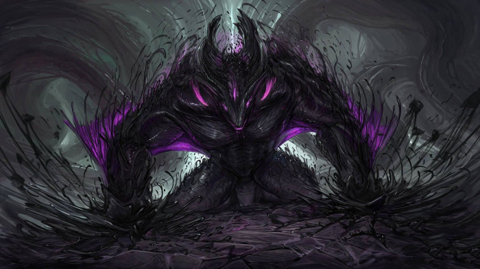 Спустя ещё немного скучного блуждания по подземелью, мы дошли до нужного места. На самом нижнем этаже этого подземелья находилось небесное хранилище, место, откуда когда-то давно вывезли небесные зубы. Именно тут Скелос обустроил пьедесталы для зубов. Но когда я подошёл к ним, тени в подземелье задрожали и постепенно слились в одну массивную темную чернильную лужу. Из нее начало вырываться нечто… очень стремное и неприятное внешне. Чёрное трехметровое, рептилоидноподобное существо с рогами и хвостом, щупальцами по всему телу, внутри из его тела исходило фиолетовое сияние. Само существо как будто состояло из темной жидкости, похожей на чернила. Любая энергия может принимать разную форму, от твердого материала до жидкого состояния. Так что это существо состояло из материализованной тьмы в жидкой форме. Его уровень был примерно девяностый, то есть он гораздо сильнее меня.