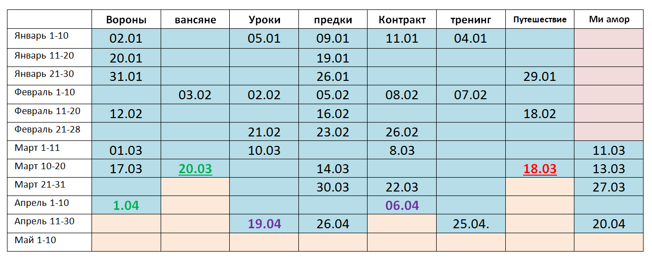По существу. Все спрашивают, как я могу писать столько работ одновременно. Делаю я это так. У меня есть график, где я отмечаю, когда какая глава была написана, и что желательно написать побыстрее: красным выделяю, то что "горит", зеленым "второе и третье место", а фиолетовым "2 запасных варианта". Для чего? Идеально было бы писать четко придерживаясь очередности, но вдохновение такая штука, которая не всегда срабатывает в нужный момент.
