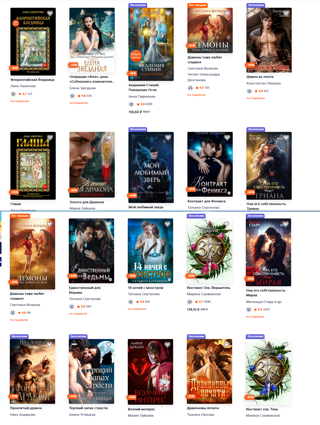 Это то, что открывается в разделе фэнтези. Если откроете хоть одну, чтобы почитать, то поймете какова их целевая аудитория. Говорят, что в коммерческие авторы подались копирайтеры, которым раньше было все равно писать про зонтики или про пластиковые окна. Теперь они штампуют "книги" с успехом по такому же принципу — хочешь фэнтези, хочешь офисный роман со строгим боссом. Печально то, что те, кто это читает, считает себя читающим человеком, а это @@@но — литературой.