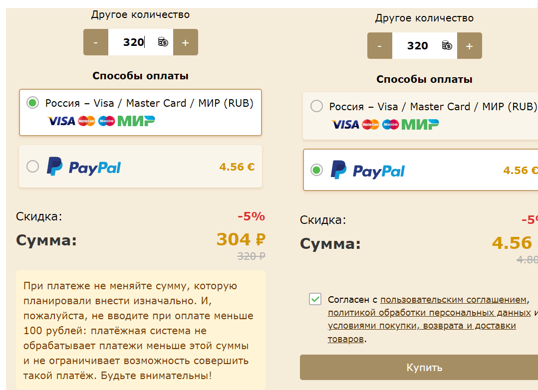 Покупате 320 монет (эквивалентно подписке Любитель, 300 руб., см. левый скриншот), но при оплате выбираете PayPal (правый скриншот)
