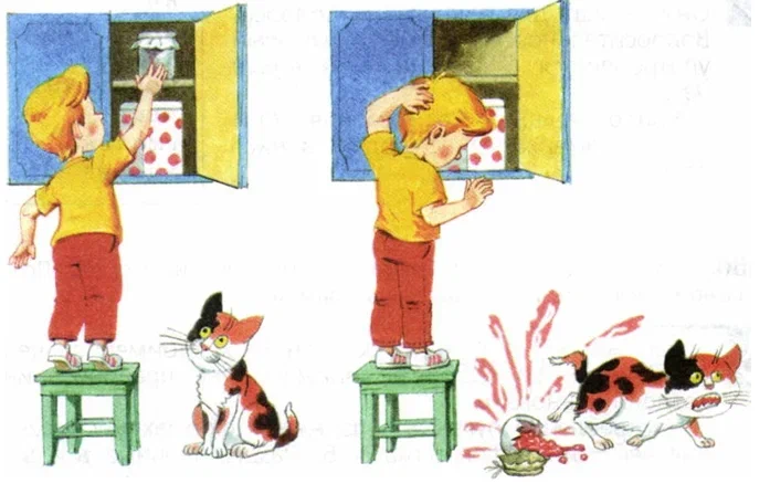 Что за рассказ они хотят от детей? Что тут писать? Однажды полез за вареньем, уронил банку вниз и она упала, а кот испугался и убежал. Где тут самый острый момент, интересно, когда я уронил банку, или когда она упала, или когда кот убежал? Наверное, это задание на развитие воображения. Эта картинка только один из моментов, а остальное нужно придумать самому. Ну что же, попробуем что-нибудь сочинить и вписать туда кота и банку с вареньем ».