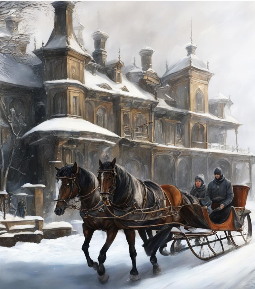 Выход на снег и мороз не доставил мне никакого удовольствия, но стараниями этого неизвестного мне Дэвида, мы оказались в снежной метели. Перед нами стоял конный экипаж. Это был обычный фаэтон, но из-за снега он передвигался не на колесах, а на полозьях. В упряжке две лошади. На крыше закреплен яркий фонарь, который освещал не только сам транспорт, но и раскиданные неподалеку тела, покрытые снегом.