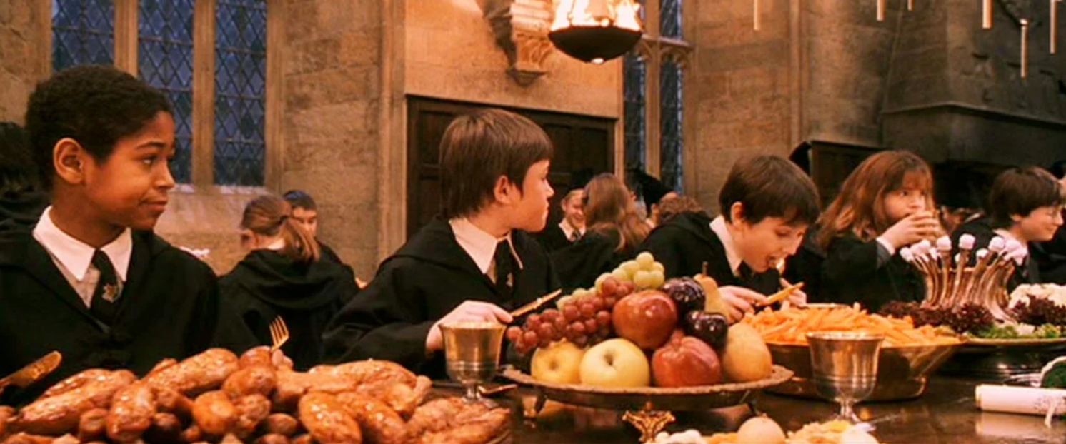 "Гарри так и ахнул от удивления — оказалось, столы давно ломятся от яств. Ему еще ни разу не доводилось видеть столько вкусных блюд вместе…"