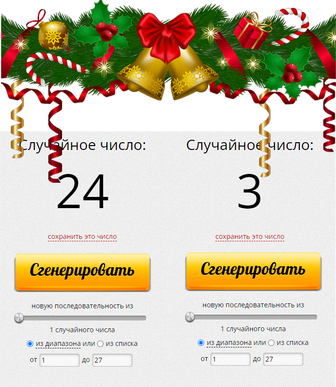 В этом розыгрыше приняло участие 27 человек. С помощью онлайн генератора случайных чисел https://randstuff.ru/ получился вот такой результат: