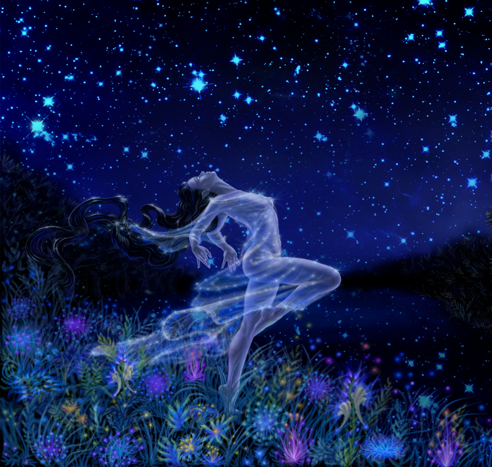 Таурмирион исчез куда-то на пару минут и пришел с небольшой арфой подмышкой. Потом пошептался о чем-то в Августусом, а затем обратился к брату и что-то ему пропел на эльфийском. Тот стал отказываться, но младший все настаивал и настаивал, в итоге Леголас с мрачным лицом взял арфу. Таурмирион встал и что-то громко сказал. Все затихли. И тут началось чудо. Он творил на траве многоцветные иллюзии светящихся фантастических цветов, а Руквуд их размножал по всей поляне. Когда вся поляна была ими покрыта, младший брат кивнул старшему и тот заиграл красивую мелодию, и в тот же момент посредине поляны появилась иллюзорная девушка исполняющая нереально красивый танец в платье сотканном, как казалось из света. Разноцветные огоньки цветов под ее ногами колыхались и переливались, а танцовщица все время стремилась в своих движениях к звездам, которыми было просто усыпано ночное небо над Лихолесьем. Таурмирион управлял движениями волшебной плясуньи обеими руками и казалось он сам исполняет какой-то завораживающий танец. На последних аккордах мелодии танцовщице все-таки удалось оторваться от земли и она воспарила к звездам, растаяв в небе. Музыка закончилась. Цветы стали гаснуть. Эльфы сидели и, казалось, боялись дышать. Никогда они еще не видели ничего подобного.