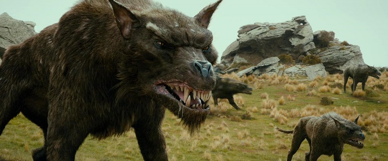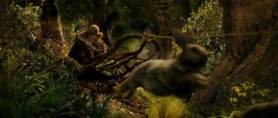 И тут же сверху на отряд спрыгнули два больших зверя, похожие на огромных волков. Один из них был мгновенно убит стрелой в голову, выпущенной Кили, а второго зарубил своим новым мечом Торин, который после сказал: