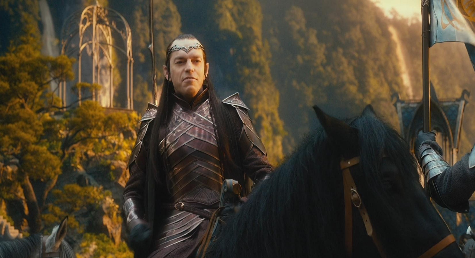 — Митрандир, приветствую. Это вы там покрошили орков с варгами? И кто это с тобой? — спросил на эльфийском чрезвычайно красивый эльф: высокий, благородной наружности, с темными волосами и ясными серыми глазами. Он не выглядел ни молодым, ни старым, его доспехи и одежда выглядели богато, а голову венчало что-то вроде серебряного витого обруча с камнями. Слева и справа за его плечами находились два совершенно одинаковых эльфа, похожих на него.