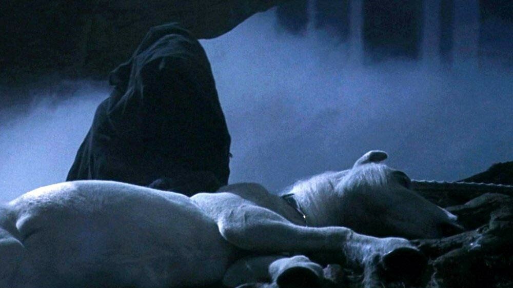 А Гарри, пройдя немного дальше по тропе, увидел единорога, из раны которого текла серебристо-голубая кровь, которая блестела в лунном свете. Он знал некоторые исцеляющие заклинания и попробовал применить их, они срабатывали, но действовали не сильно. Гарри не мог видеть, как умирает такое красивое животное. Тогда он вспомнил о зелье, которое он приготовил, экспериментируя с рецептами из книги Принца-полукровки. Он быстро порылся в сумке и нашел его, открыл фиал и вылил на зияющую рану на шкуре единорога, которая стала постепенно затягиваться. Он стал гладить его красивую жемчужно-белую гриву, и был удивлен, что единорог не сопротивляется этому.