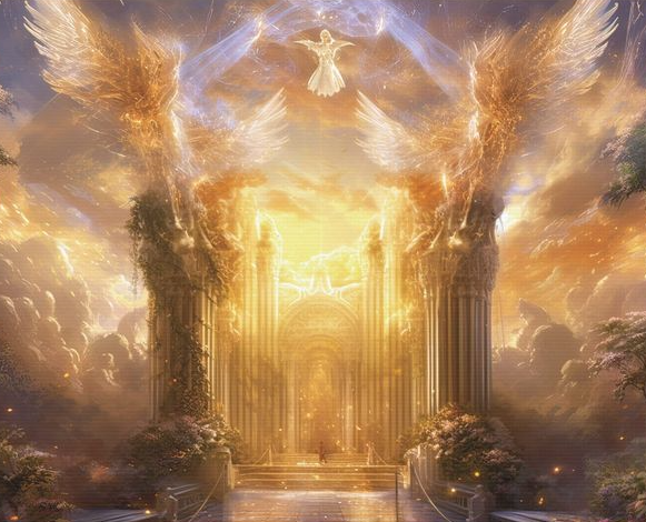 Больше не было помпезного зала, огненного трона, алых с золотым цветов убранства. Золото осталось, да, но лишь в виде запертых резных врат небывалой красы. И огонь сохранился… пылали мечи крылатых ангелов, совсем не “горящих” желанием нас впустить. Полыхала светом земля вокруг, и небеса сияли ею изнутри.