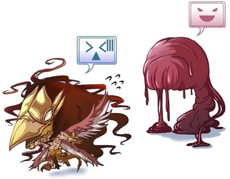 К замершей парочке подошли трое: четырехкрылый людоптиц — источник мужского голоса; огромная туша исполина, что до сих пор не издала и звука; и непонятный комок красного фарша с плавающими внутри него шариками-артефактами, тело которого ни на секунду не переставало вибрировать, исторгая гогот — слизь. Пытающийся что-то доказать слизню, людоптиц был высокопарно проигнорирован, пока сама желеобразная масса уже подплывала к своему знакомому.