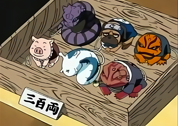 — И Кацую, и даже М*нда… — продолжил он, подойдя ближе — Это пёс Какаши, свинка, кажется, связана с Цунаде. Не уверен, давно её не видел. Только что это за жаба сверху справа…