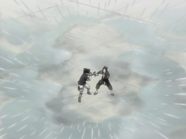Забуза Момочи выпрыгнул из воды, что осталась от первого клона, прямо за мной используя «Технику Слияния С Водой». Он прятался внутри своего же водяного клона.