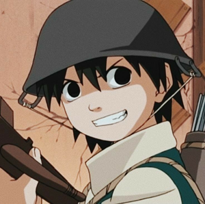 — А вы реально умеете огнём дышать? — прибежал радостный мальчик, с котелком на башке и арбалетом в руках. Ну, хоть не заряженным, куда родители смотрят? Вырастили маленького ополченца. Шкет совсем не такой, как я его запомнил по аниме.