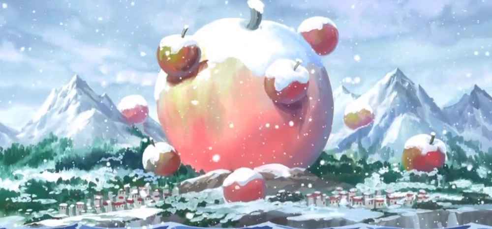 Действительно остров. Когда уже, подплывали к острову, я смог получше его разглядеть. Походу, это зимний остров. И там огромное яблоко, даже выше гор, которые видны позади. И на нём, около стебля ещё три яблока и пять разбросаны рядом. Вот откуда такое название. Интересно, это просто здания такие, просто выполнены в таком стиле, или реально огромные яблоки?