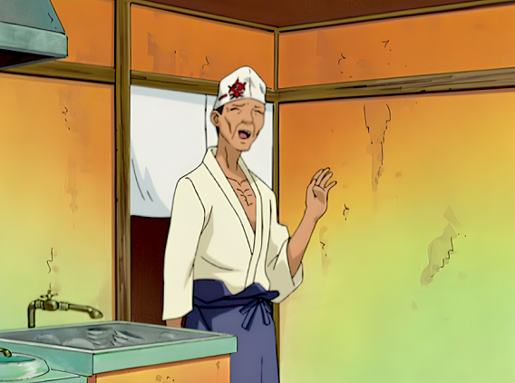 — Ну-ка… следи…за языком, молодой человек… — повар поправил спадающий фартук, еле передвигая руками — Я всего-то сел на оздоровительную диету! Аяме, принеси всё, что осталось…
