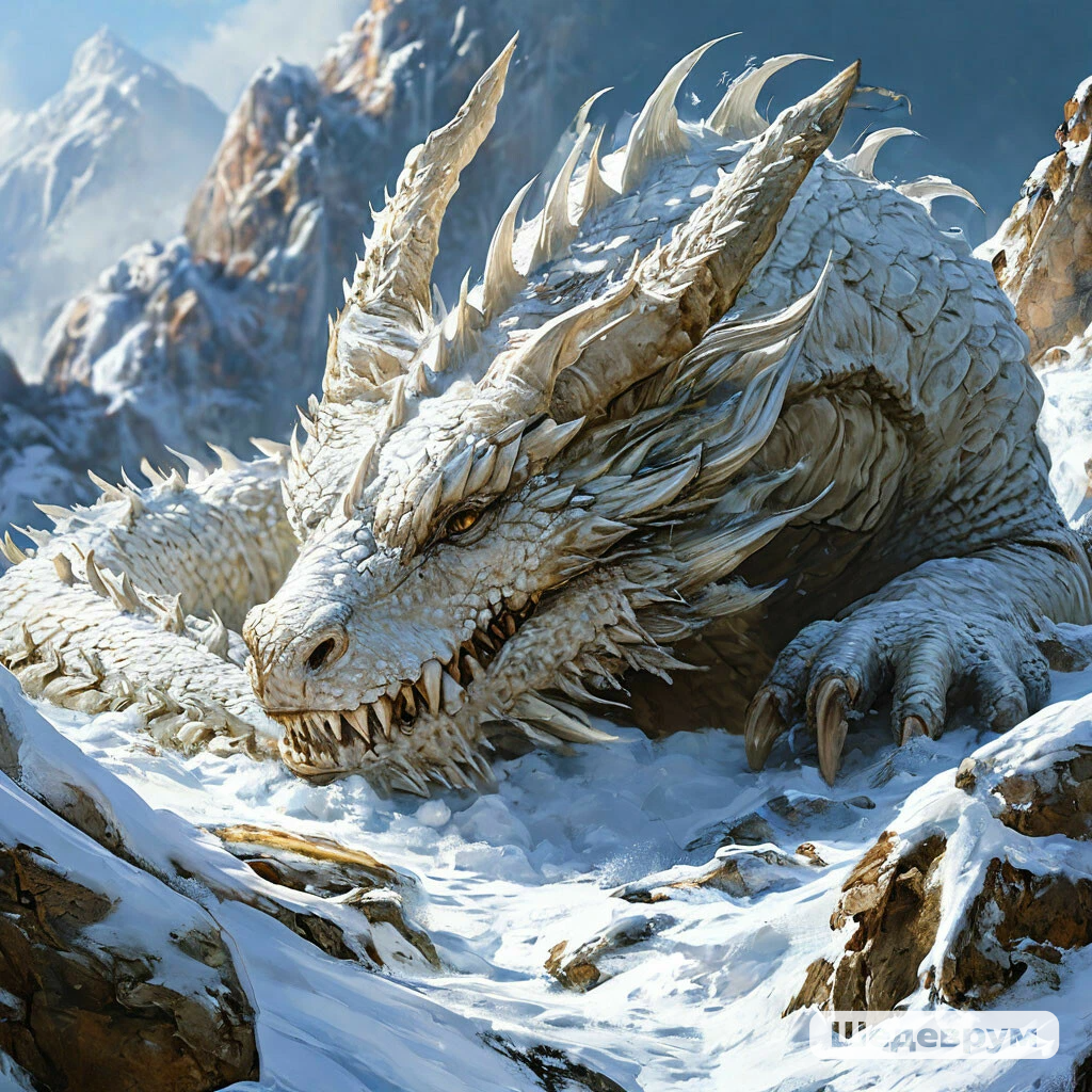 Дракон, не торопясь приподнял голову, увенчанную костяной короной сделанной будто из чистейшей платины. Даже сквозь мрак было видно, как они слегка святятся, даруя легкое освещение в этом месте. Место же само по себе было исполинской полостью глубоко под горой и повсюду был снег и лед.