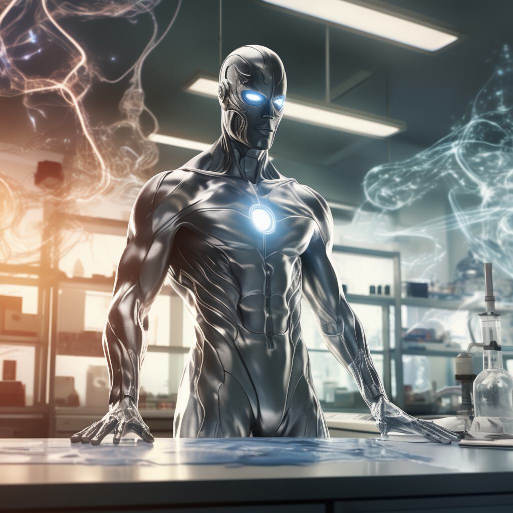 Трёхлитровый баллон пульверизатора опустел буквально за минуту. Лаборантка покрыла этим составом всё тело подопытного, из-за чего оно преобразилось в боевую форму в виде серебряного человека.