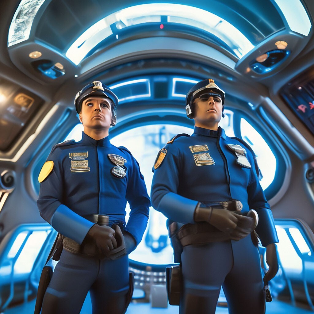На выходе из ремонтного отсека их ждала парочка копов в форменной одежде. Черные кители и штаны с голубой полосой, заправленные в берцы с высоким голенищем, плотно облегали их накаченные тела. Кокарда с номером станции была начищена до идеала, так что в неё можно было увидеть своё отражение. По движению копов было заметно, что у них установлены импланты на силу и выносливость. Угрюмые и чисто выбритые лица излучали пристальное внимание, направленное на инспекторов.