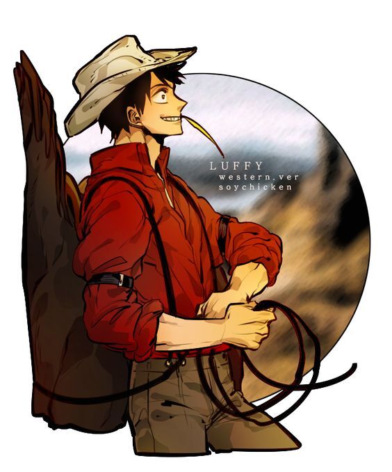 Луффи в своей красной рубахе и узких ковбойских штанах ,с ковбойской шляпой и кнутом в руках.