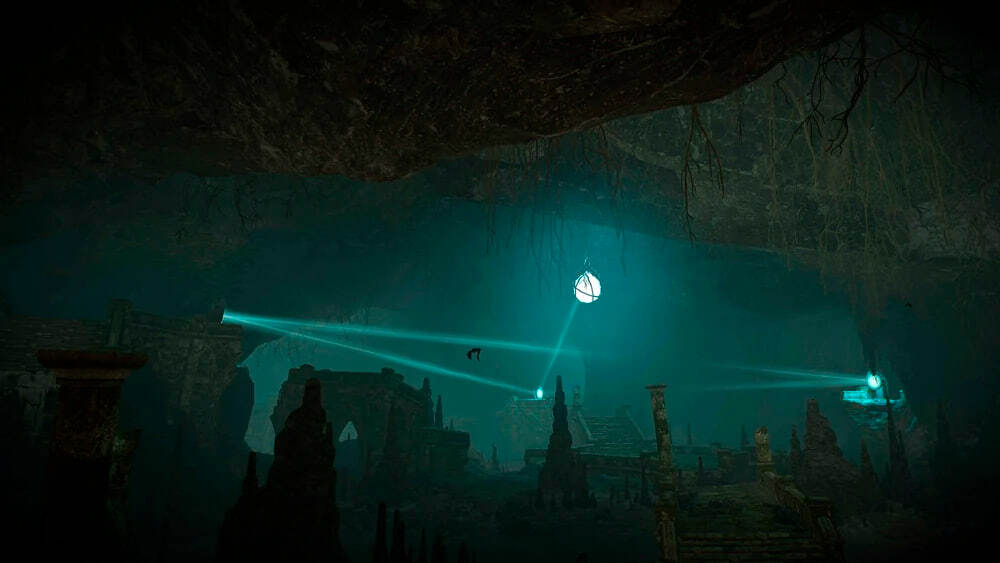 Спустившись по лестнице, я оказался посреди огромной пещеры природного происхождения. Единственными следами эльфов здесь были только наполовину развалившийся мост и зеркала. Большое количество зеркал, которые отражали лучи света, падающие из отверстий в своде пещеры.