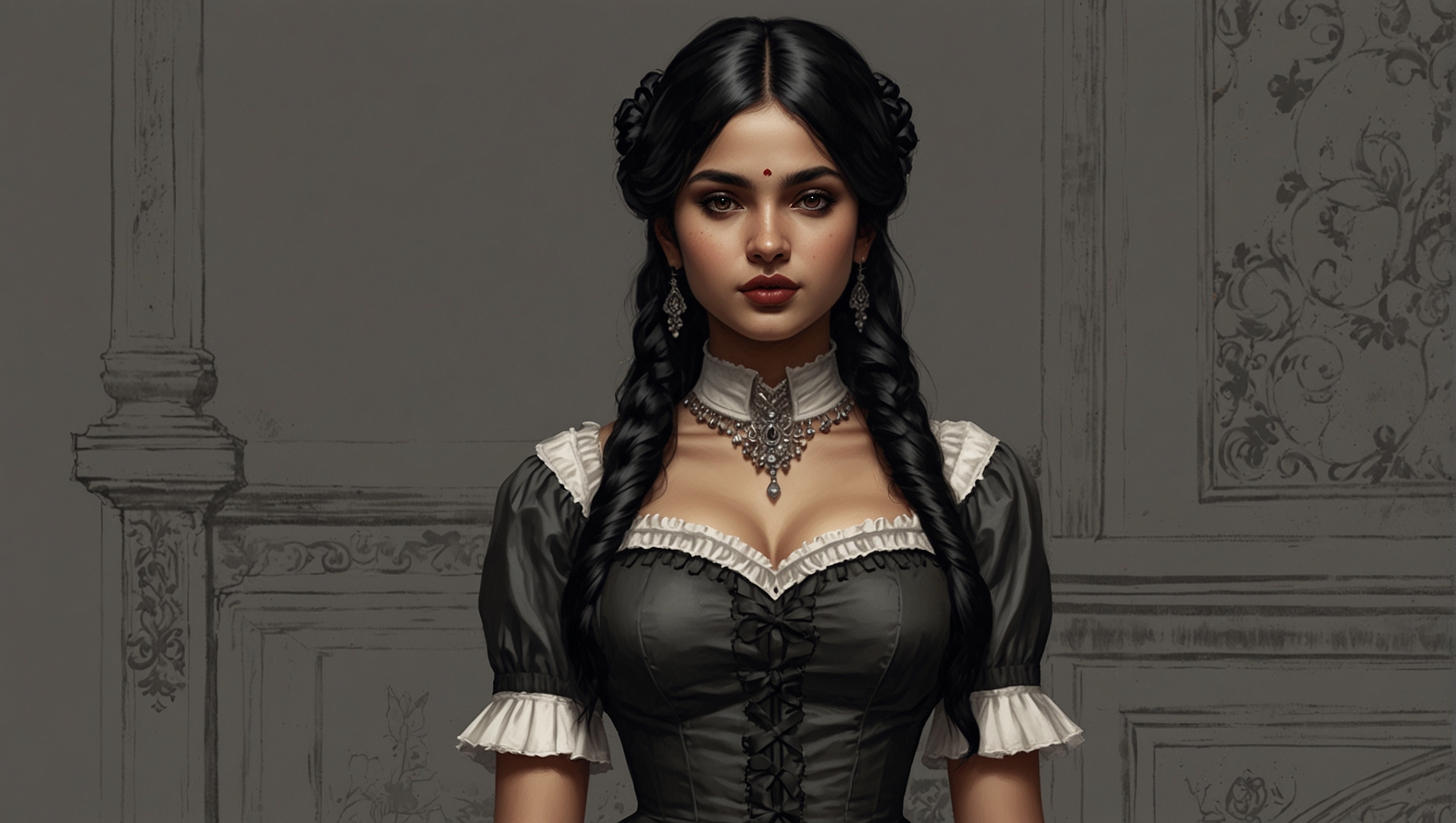 В коем Парвати действительно была необычайно красива и элегантна. Плотно облегающий лиф черного цвета с высоким воротником подчеркивал её стройную фигуру, а белоснежный передник с аккуратным кружевом придавал образу утончённую строгость, создавая соблазнительный контраст с глубоким оттенком кожи.