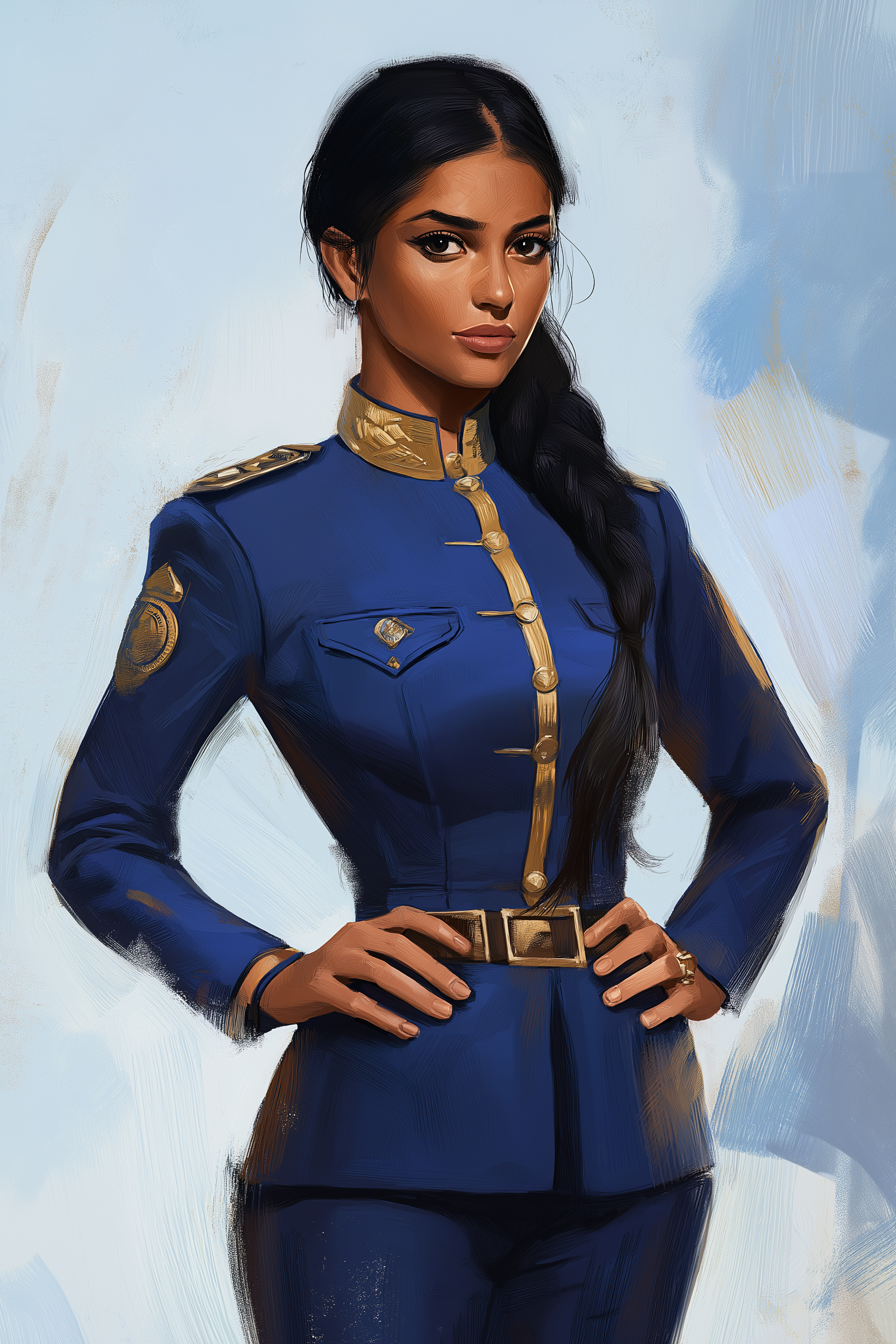 Внутри перед зеркалом стояла её мать, облаченная в строгий военный мундир глубокого синего цвета, который подчёркивал её стройную фигуру. Наряд, хоть и казался простым, был безупречно скроен, излучая ощущение величия и достоинства. Золотые пуговицы и отделка на воротнике и манжетах блестели, как солнце на утреннем небе, добавляя её облику некий ореол торжественности. Каждый элемент униформы — от знаков отличия на плечах до идеально подогнанного пояса — говорил если не о высокой должности, то о незаурядной роли в каком-то важном деле.