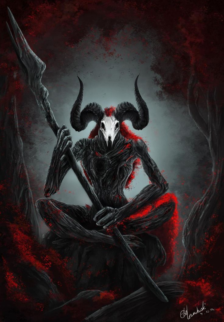 Сквозь густой туман, который медленно стал рассеиваться он заметил человекоподобное существо. Черное, как окаменевшая древесина, с черепом на голове и закрученными рогами, оно сжимало деревянное копьё в руках и смотрело прямо на него пустыми глазницами.