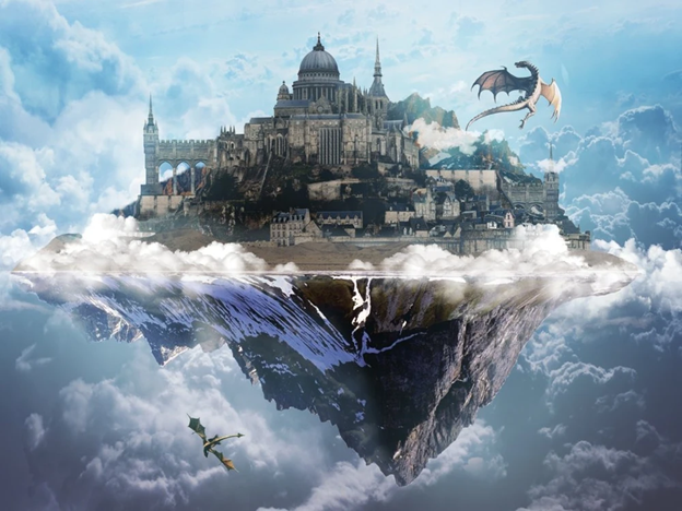 Ох… Придя в себя я смог, наконец, осмотреться, куда это нас телепортировало… А телепортировало нас на землю, к глубокому каньону… плевать на него! Всё внимание было сфокусировано выше, на парящим над ним куском земли, вокруг которого нарезали круги огромные драконы и более маленькие виверны. А на земле на той стоял замок из серого камня, чьи башенки и шпили были прекрасно нам видны.