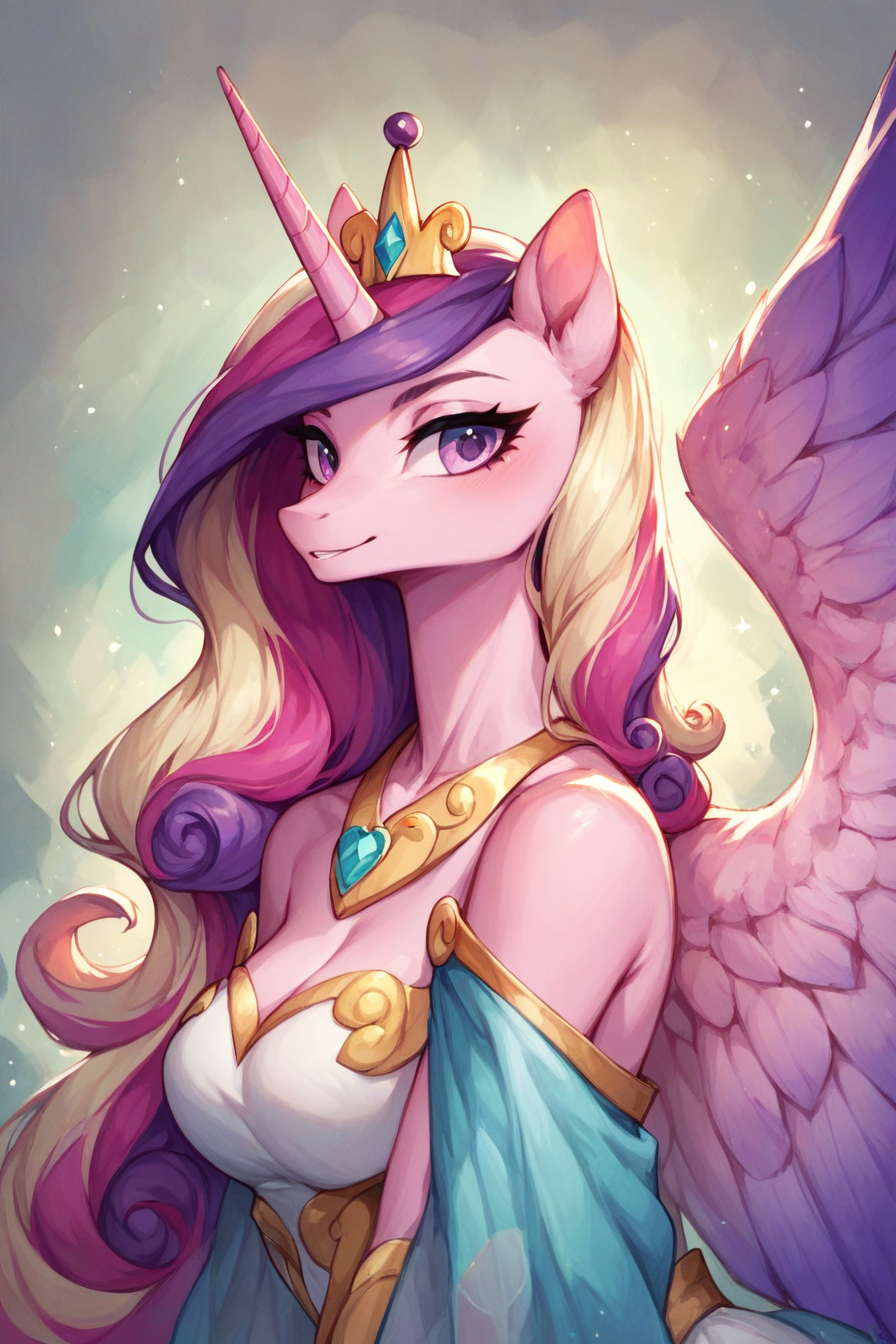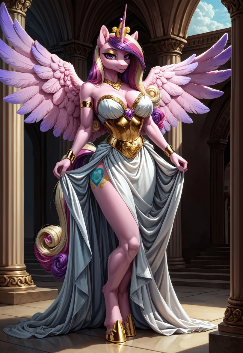Белое платье с золотой огранкой подчёркивала стройные черты талии, плотно обхватывая ту, а золотые "облака" на кончиках верхней части платья у бюста, обозначали грудь не большого, но уверенного среднего размера, "больше среднего", как говорит сама Каденс. Привычный амулет-браслет на груди, с символом Каденс — синего знака сердца. Чуть ниже плеч, закреплённые на между собой на вроде плаща, её изящные руки обхватывала прозрачная бирюзовая вуаль, с золотым началом. Вуаль падала до начала её широких бедер, от которых в платье шёл небольшой разрез, открывающий вид на стройные копыта, на которых так же были надеты церемониальные золотые подковы.