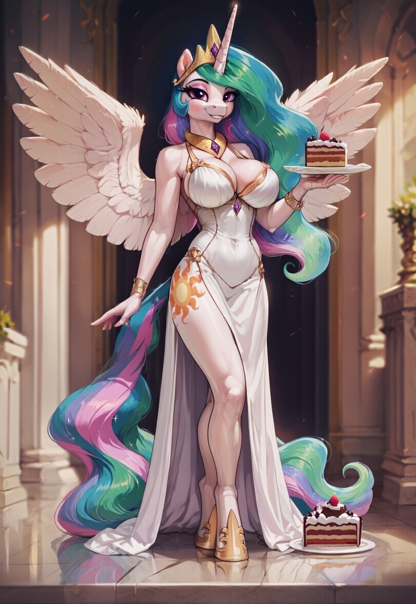 Принцесса Солнца. Правитель Эквестрии, известная своей небесной красотой, статной фигурой, что лишь слегка прибавила в бёдрах за последний век, выдающейся грудью, широкими бёдрами, стройными ногами и прекрасной мордочкой, с мягкими губами и волшебно фиолетовыми глазами. Развивающая на "невидимом ветру" радужная грива, полная магии, ухоженный и пушистый белый мех, украшаемый кьютимаркой Солнца на бёдрах, большие магические крылья, могущие творить множество древних заклинаний самого Звёздоборода, идущие лишь за величественным белым рогом, что отлично дополняет золотую корону, добавляясь к символу власти как её часть.