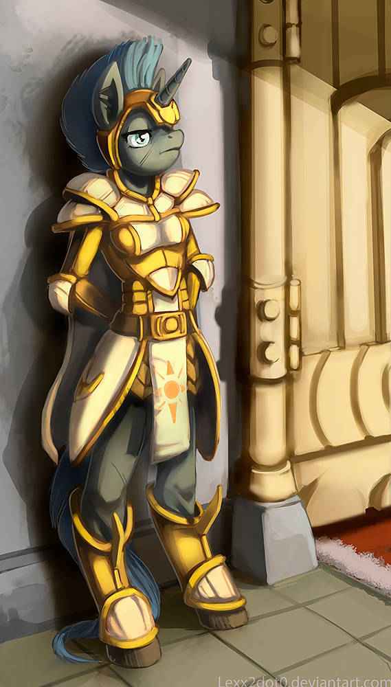 — Назовите имя и цель своего прибывания. — ровным и чётко выговаривающим слова низким голосом задал ему вопрос стражник. Броня золотого цвета, нагрудник, наплечники с узорами, защита для ног… Шлем с "ирокезом" из гривы, либо это была частью шлема. Спайк никогда не интересовался этим вопросом.